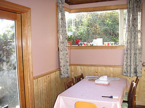 ![]() リビング海を臨む側の壁を抜いて、ダイニングポーチに通じる掃きだし窓を設置。 | ![]() 明るいダイニングドライウォール仕上げ+パイン材で腰板を施工。 椅子が壁に当たった際の傷防止にもなる。 |